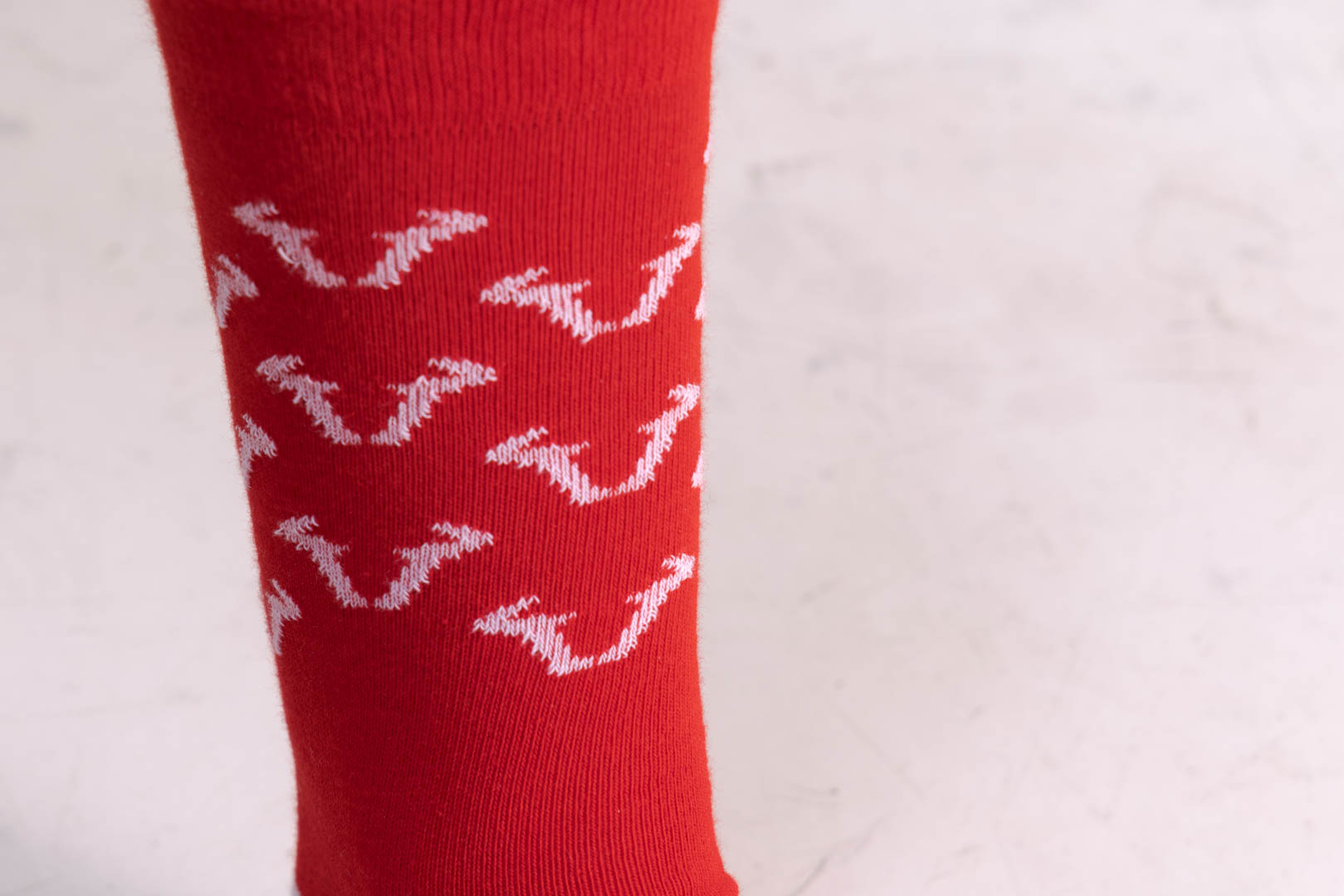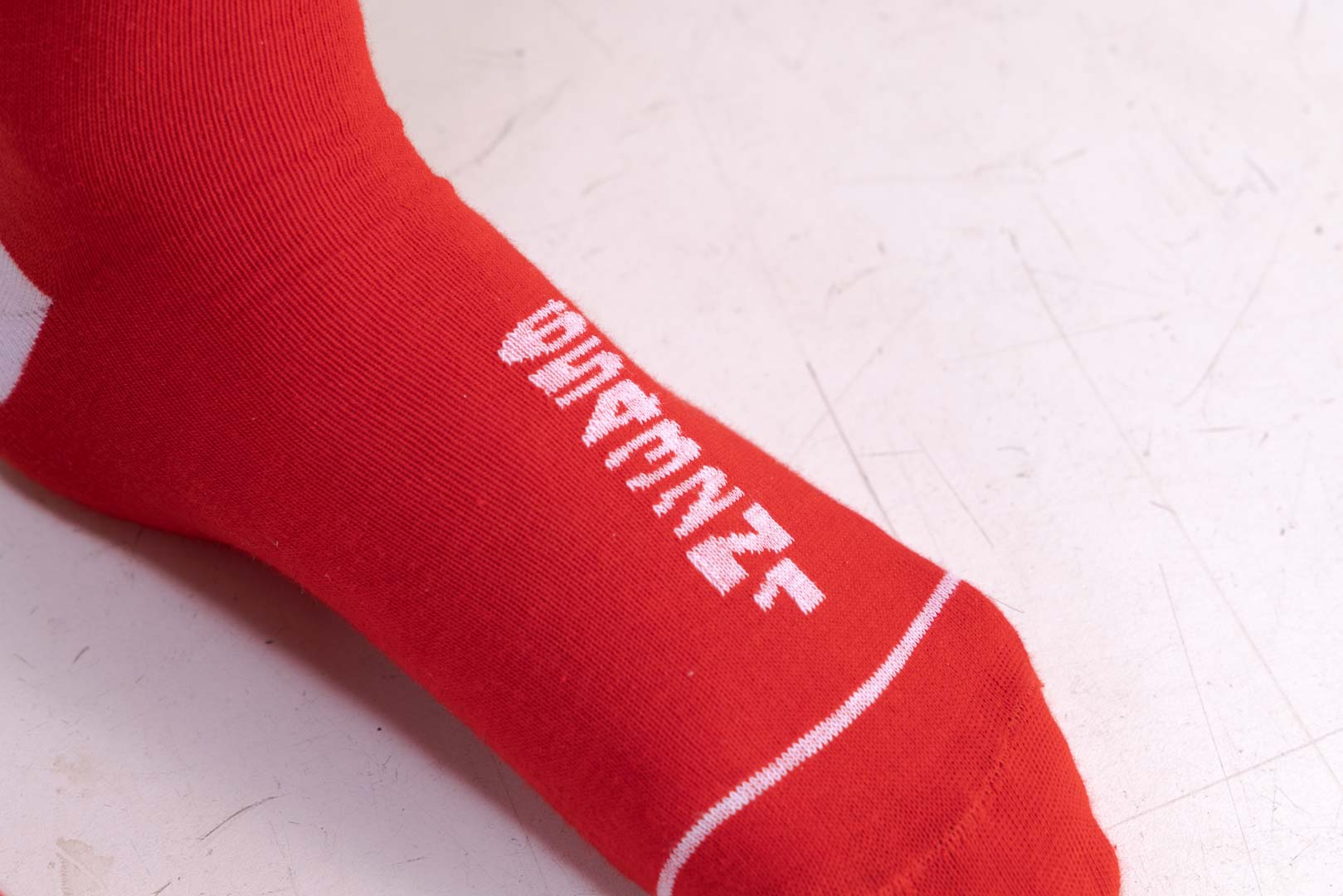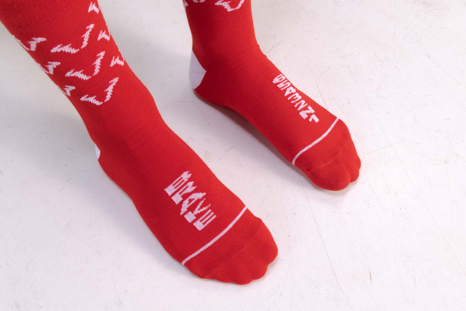 Perfektes Weihnachtsgeschenk für Motorradfans: Die SW-MOTECH Weihnachtssocken in Größe 43-46 mit Bullen-Logo. Das kreative Design zeigt eine Ganganzeige auf dem linken und den Schriftzug "BRAKE" auf dem rechten Socken. Farbe: Rot/Weiß.