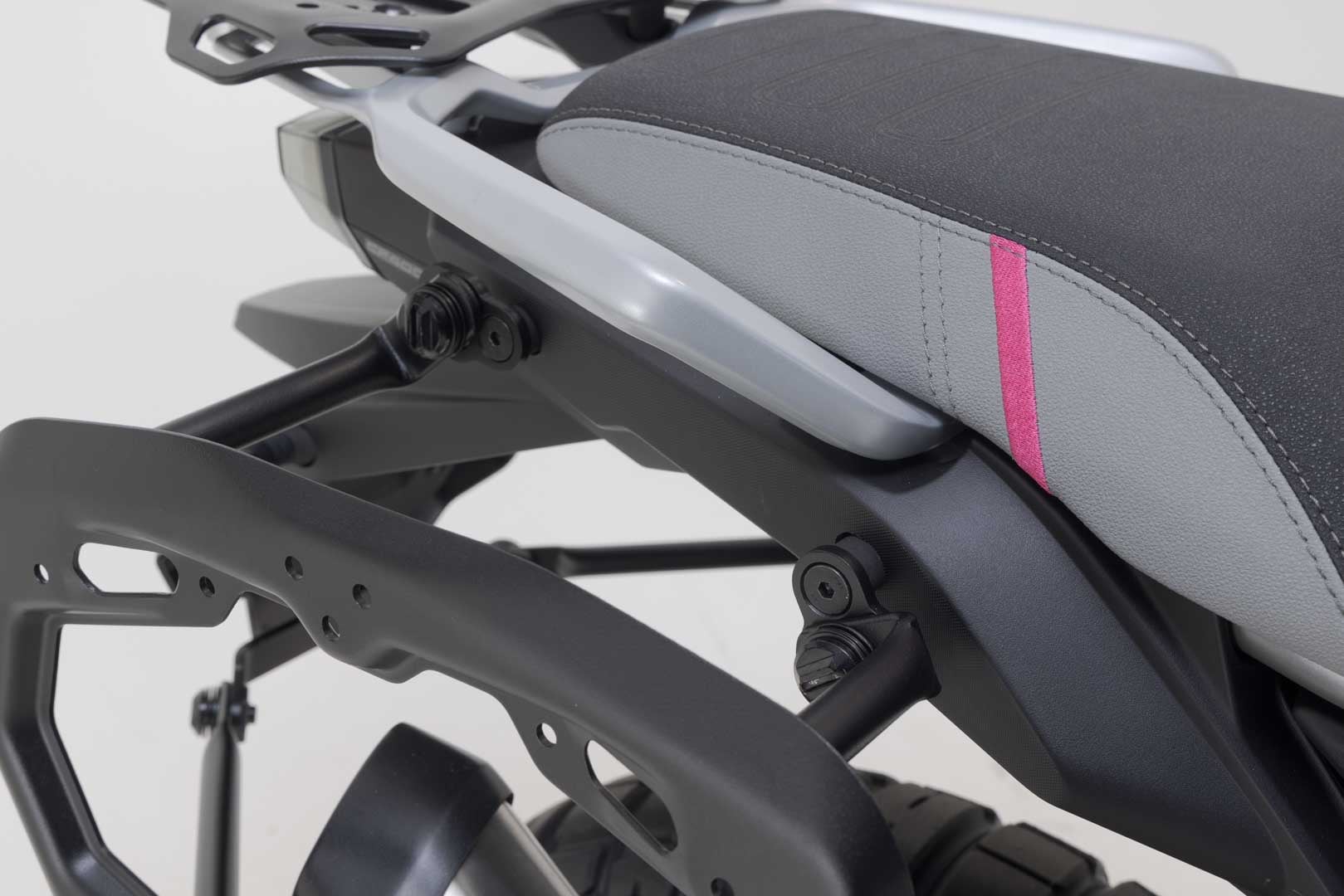 Der modellspezifische PRO Seitenträger aus 2,5 mm starkem Stahl bietet sicheren Halt für Seitenkoffer und SysBag-Taschen. Mit robusten Schnellverschlüssen, Funktionsbohrungen und einfachem Abnehmen ist er ideal für Abenteuerfahrer. Adapterkits für verschiedene Koffersysteme sind separat erhältlich.