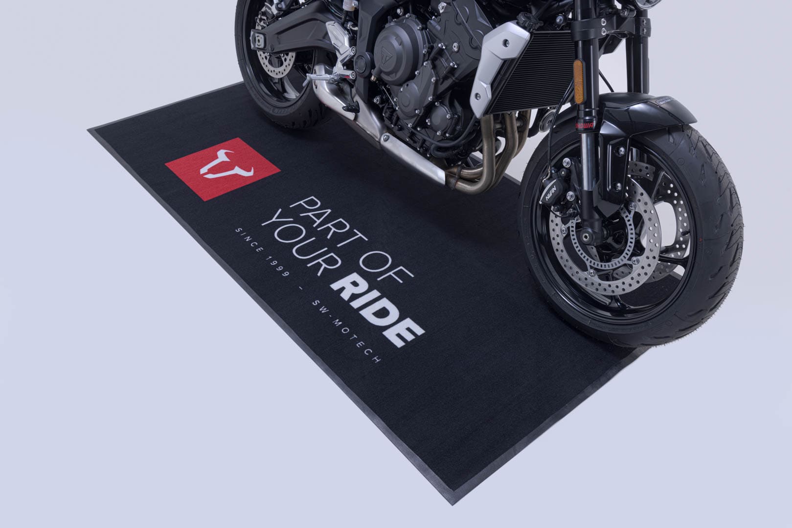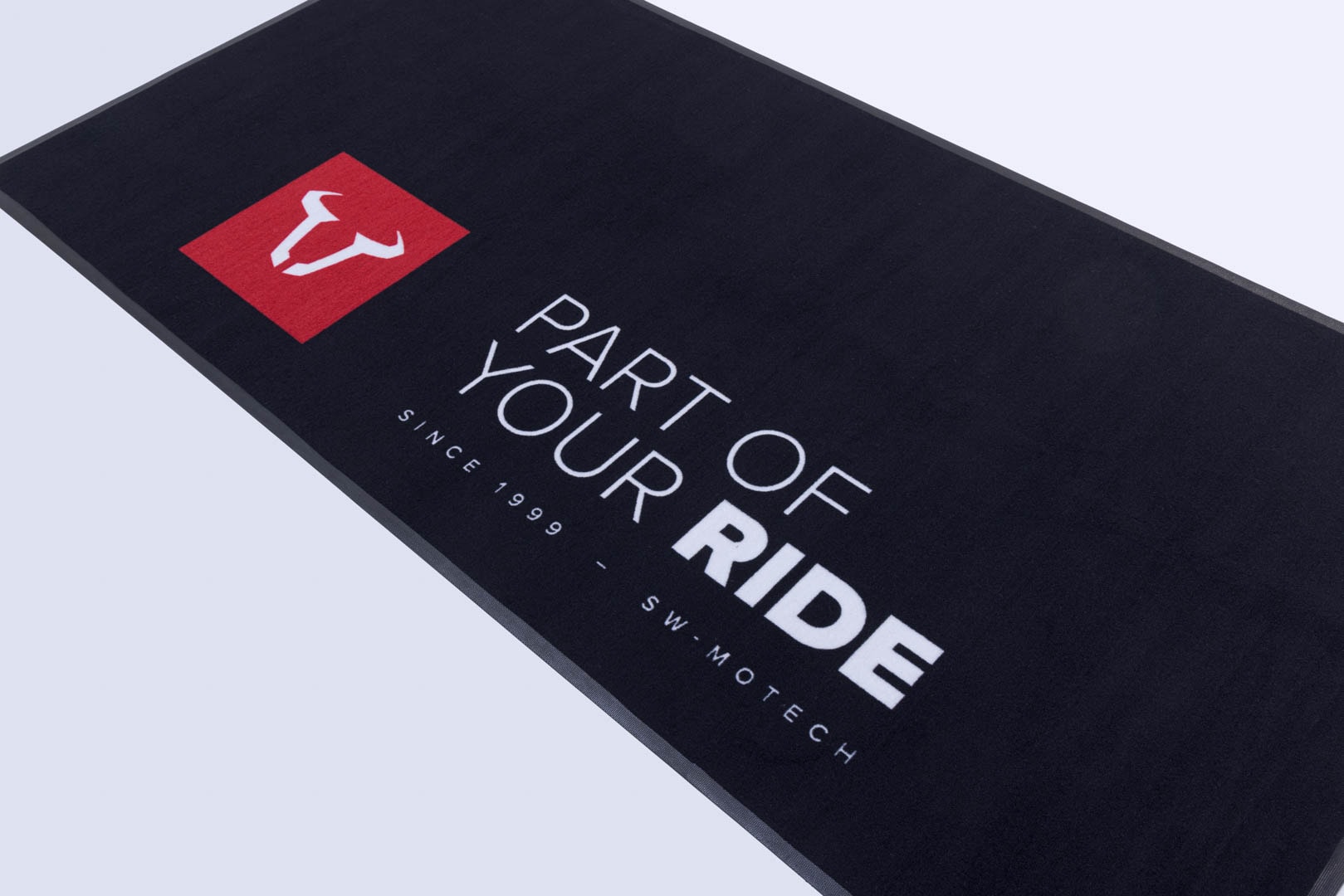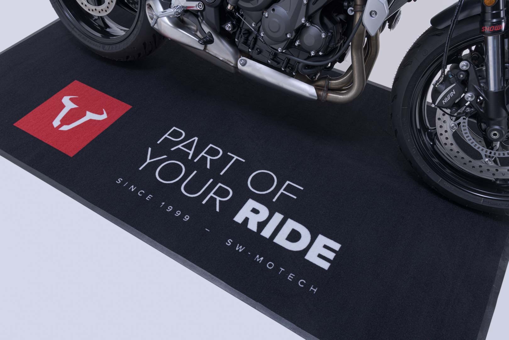 Il tappeto sottomoto si distingue grazie al logo SW-MOTECH di grandi dimensioni e non passa inosservato in showroom, garage e officina. Il tappeto non solo propone un'estetica accattivante, ma convince anche per il livello eccellente dei materiali di realizzazione. Il tappetino ignifugo assorbe olio, acqua e polvere e soddisfa i requisiti della FIM.
